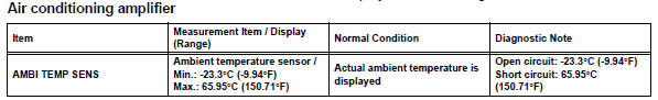 The sensor sends a signal to the air conditioning amplifier via the combination meter. The resistance of the ambient temperature sensor changes in accordance with the ambient temperature. As the temperature decreases, the resistance increases. As the temperature increases, the resistance decreases.