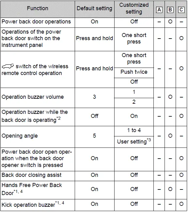 *3:The open position is set by the power back door switch. *4:When the towing hitch is installed, Hands Free Power Back Door does not work.