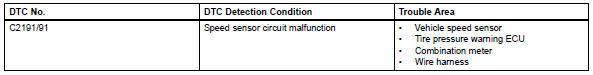 The tire pressure warning ecu receives a speed signal from the combination meter. This dtc is stored upon entering test mode, and cleared when a vehicle speed signal of 12 mph (20 km/h) is detected for 3 seconds or more. The dtc is output only in test mode.